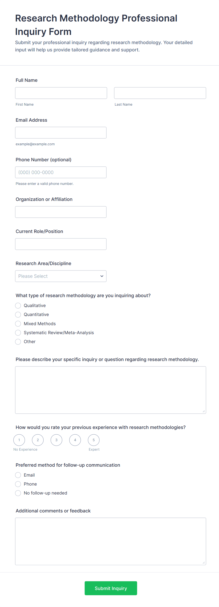 Inquiry Form Templates are versatile tools that can be adapted to a wide range of scenarios, helping organizations efficiently collect and manage incoming questions or requests. Here’s how they can be used, who can benefit, and how their structure may vary: