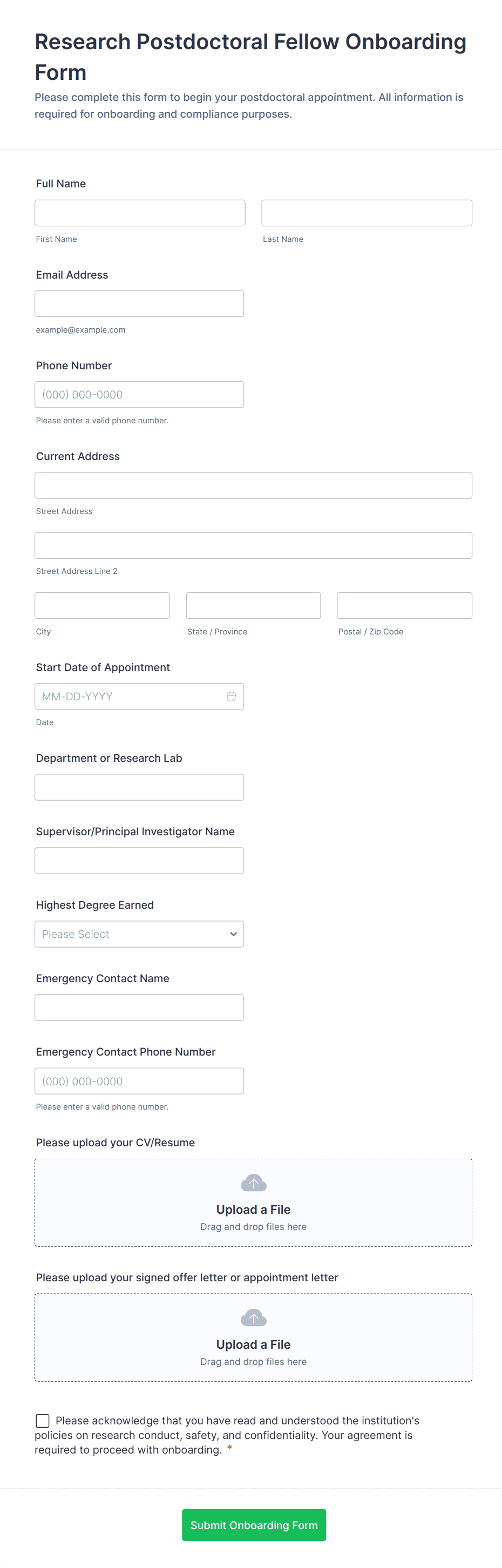 - Employee onboarding: May require fields for personal details, tax forms, emergency contacts, and policy acknowledgments.