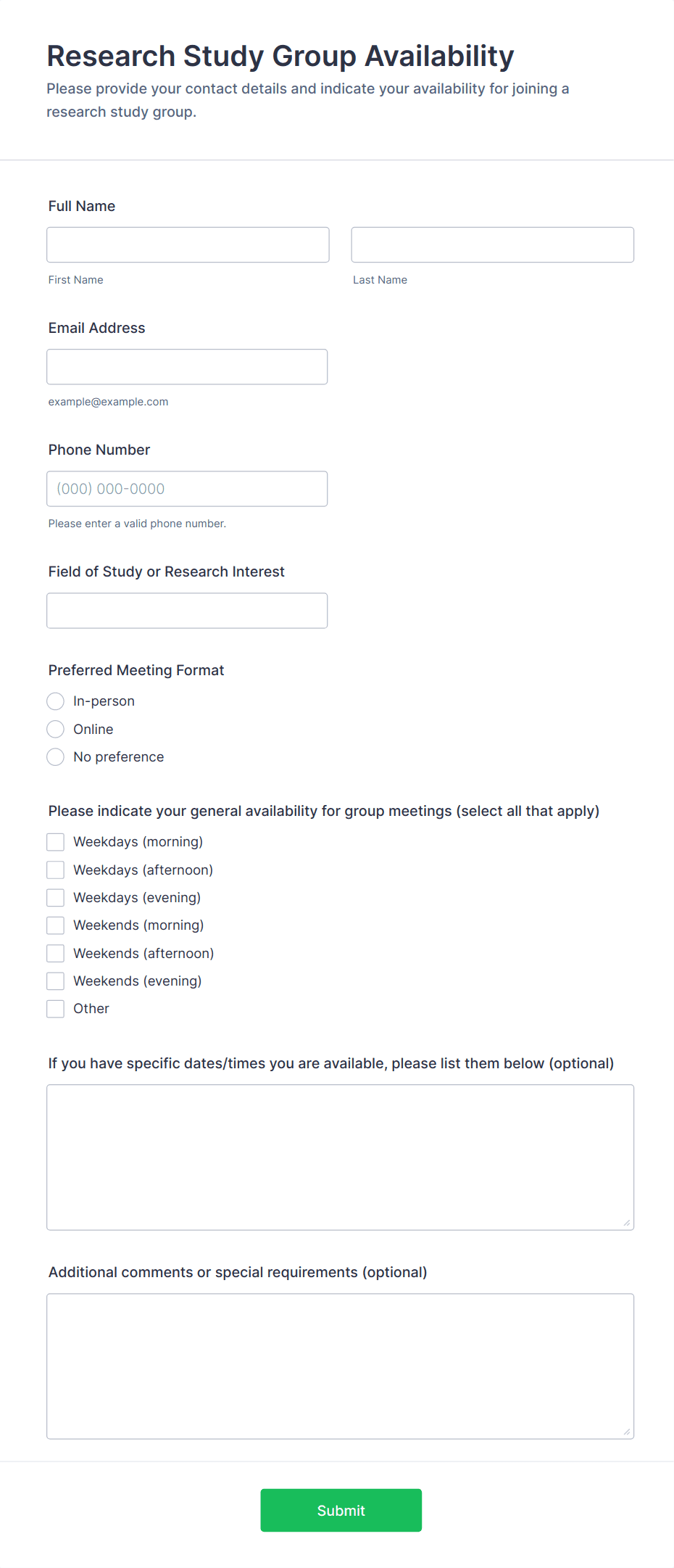 A meeting form is an online tool used to organize, schedule, and manage meetings by collecting essential information such as attendee details, agenda items, and feedback.