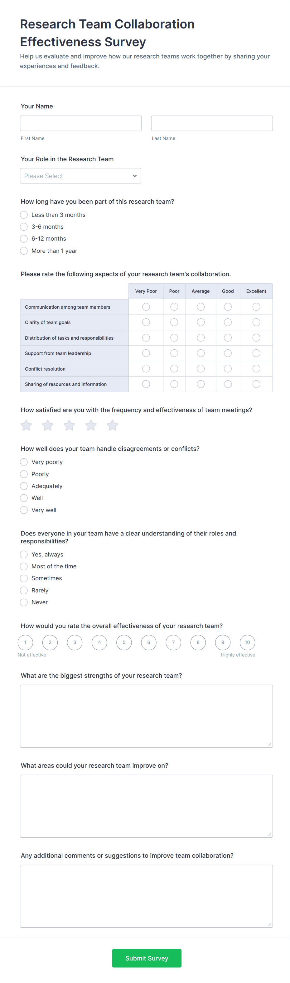 - For employee surveys, include questions on job satisfaction, leadership, and work environment.