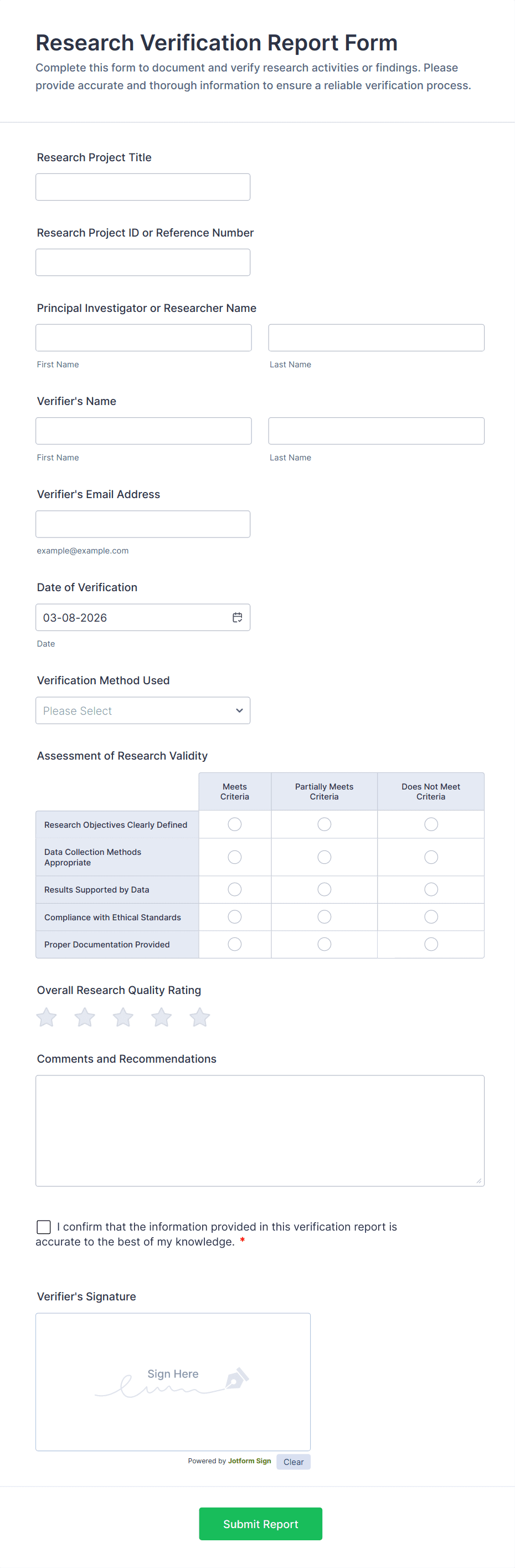Verification forms are specialized digital tools designed to authenticate, validate, or confirm information provided by individuals or organizations. These forms are commonly used to verify identities, credentials, employment status, addresses, or other critical data points in a secure and efficient manner. Typical use cases include onboarding new employees, confirming student enrollment, validating customer identities for financial services, or ensuring the accuracy of submitted documents in compliance processes. By streamlining the verification process, these forms help organizations reduce fraud, maintain regulatory compliance, and build trust with their stakeholders.