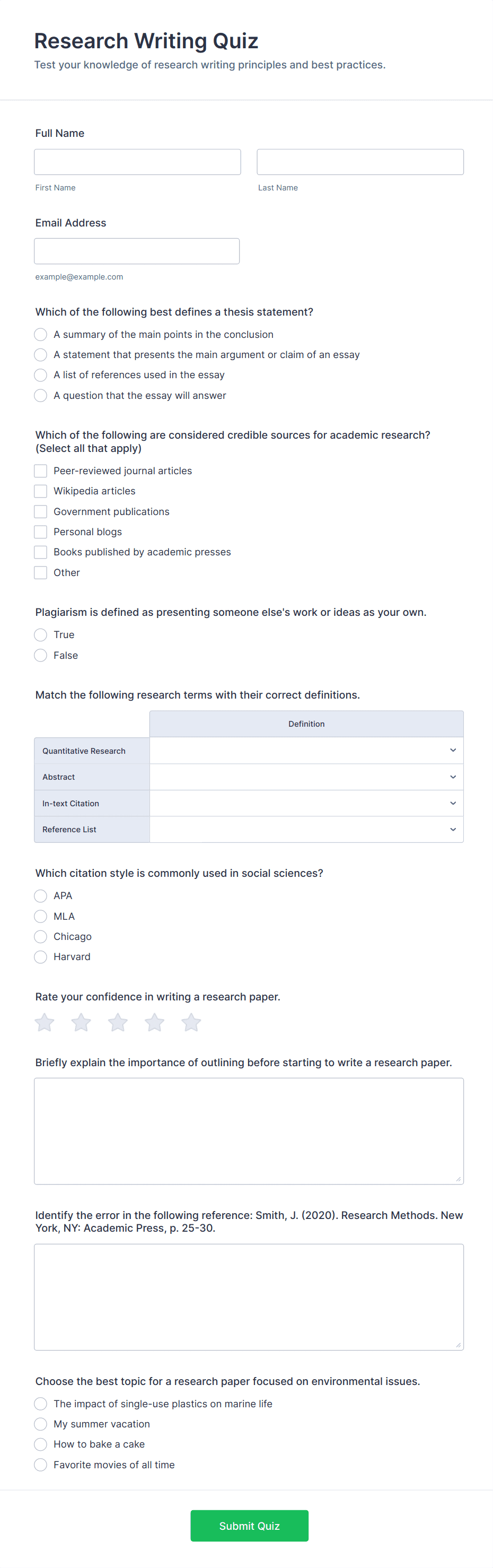 Quiz Templates are pre-designed forms specifically created to facilitate the process of building quizzes for a variety of purposes, such as education, employee training, lead generation, event engagement, and more. These templates provide a structured way to present questions, collect answers, and automatically score or evaluate responses. Whether you’re a teacher assessing student knowledge, a business running a product knowledge test, or a marketer creating a fun personality quiz, Quiz Templates offer a flexible foundation to suit your needs. They can be used for online exams, trivia games, onboarding assessments, customer feedback quizzes, and interactive learning modules.