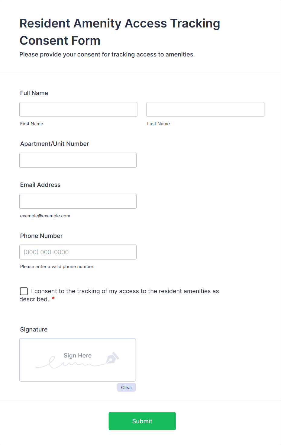 • Maintenance Requests: Include issue description, urgency, and photo upload options.