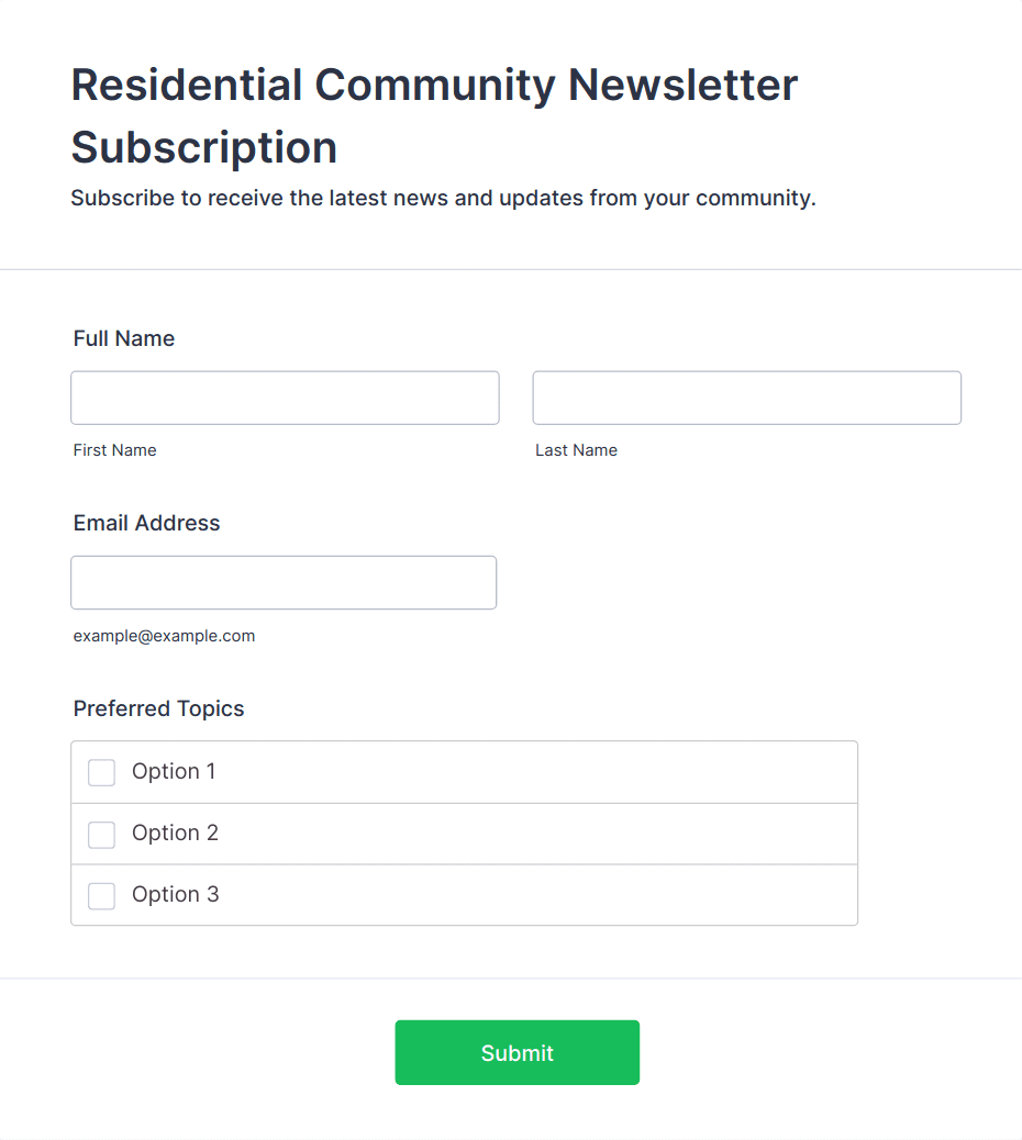 - Newsletter Sign Up: Typically requires only name and email, with optional interest checkboxes.