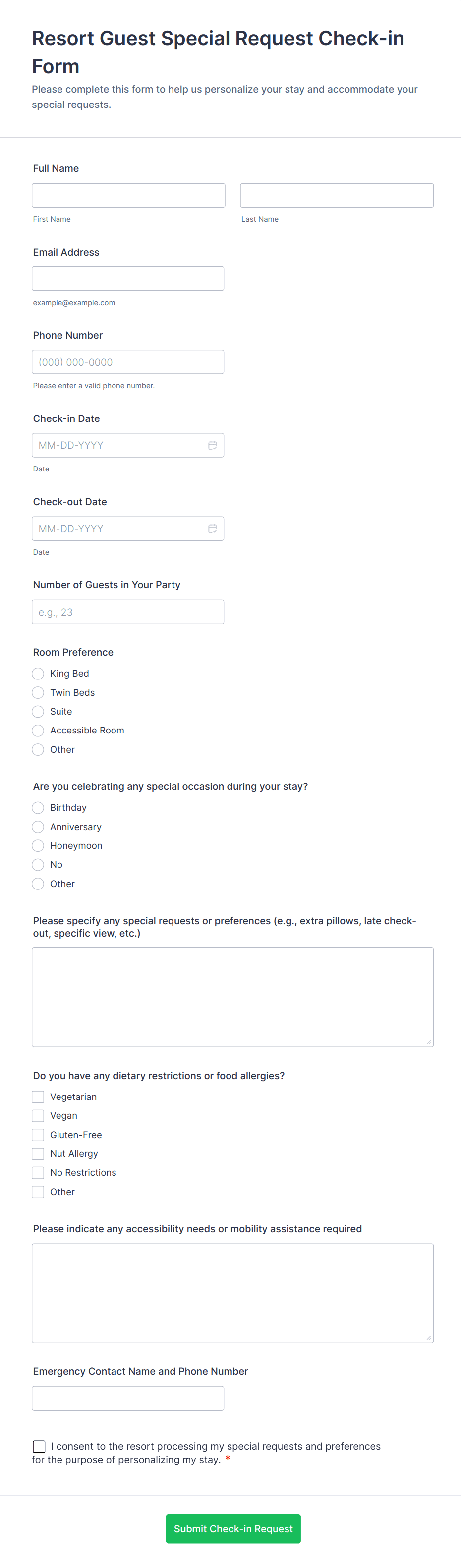 - Hotel Check-In: Collects reservation details, payment information, and guest preferences.
