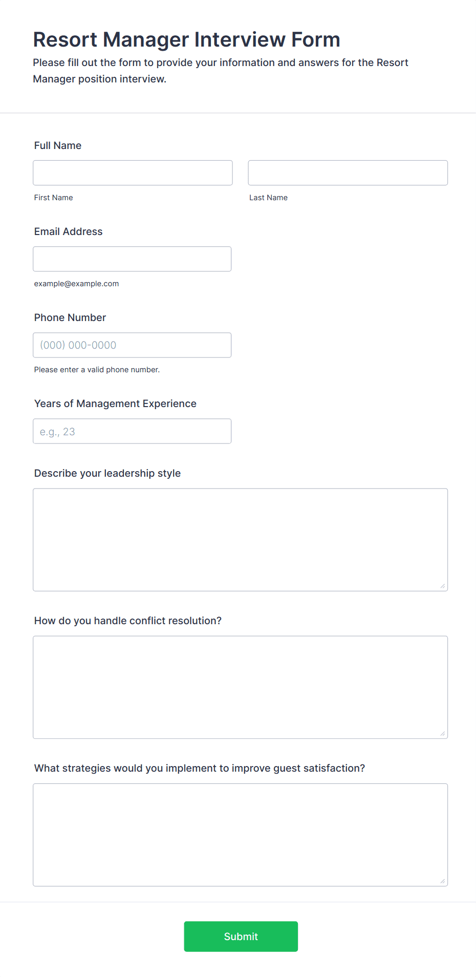 The Customer Support Interview Form helps HR professionals collect candidate information for customer service roles, streamlining the interview process and improving data collection.