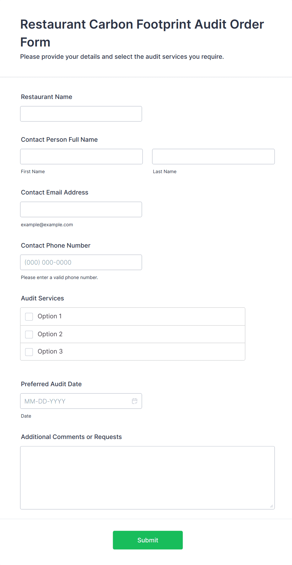 An audit form is a structured document used to systematically evaluate, inspect, or review processes, operations, or compliance within an organization. It helps standardize data collection and reporting during audits.