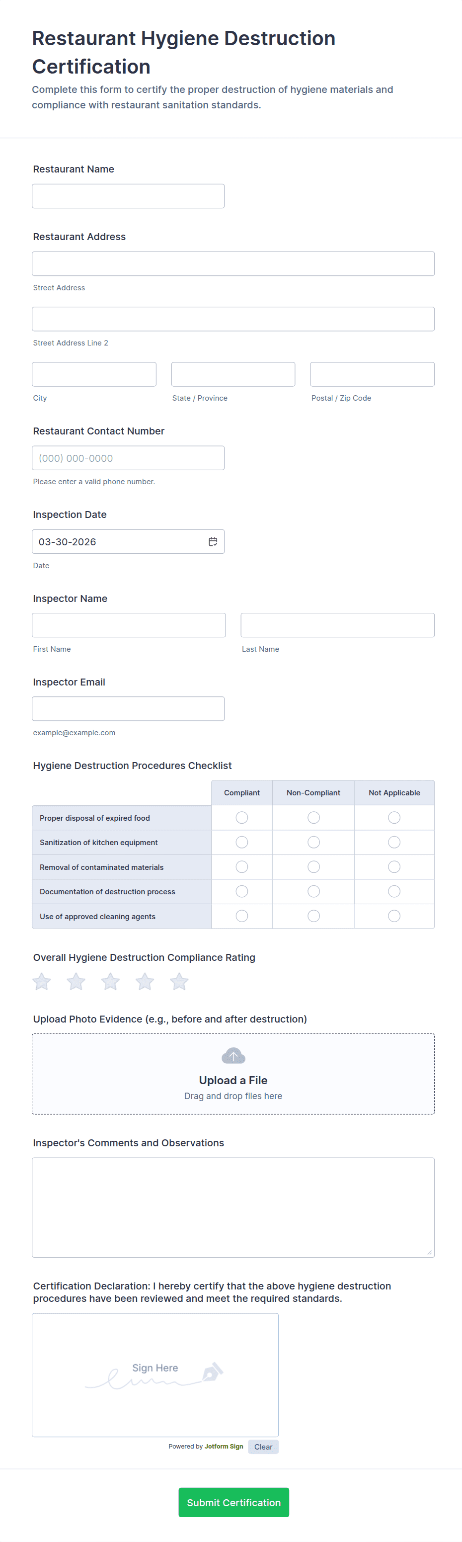 Creating an effective inspection form with Jotform is straightforward and highly customizable, allowing you to address the unique requirements of your inspection process. Whether you’re conducting safety audits, equipment checks, or property walkthroughs, Jotform’s platform ensures your forms are comprehensive, user-friendly, and accessible from any device.
