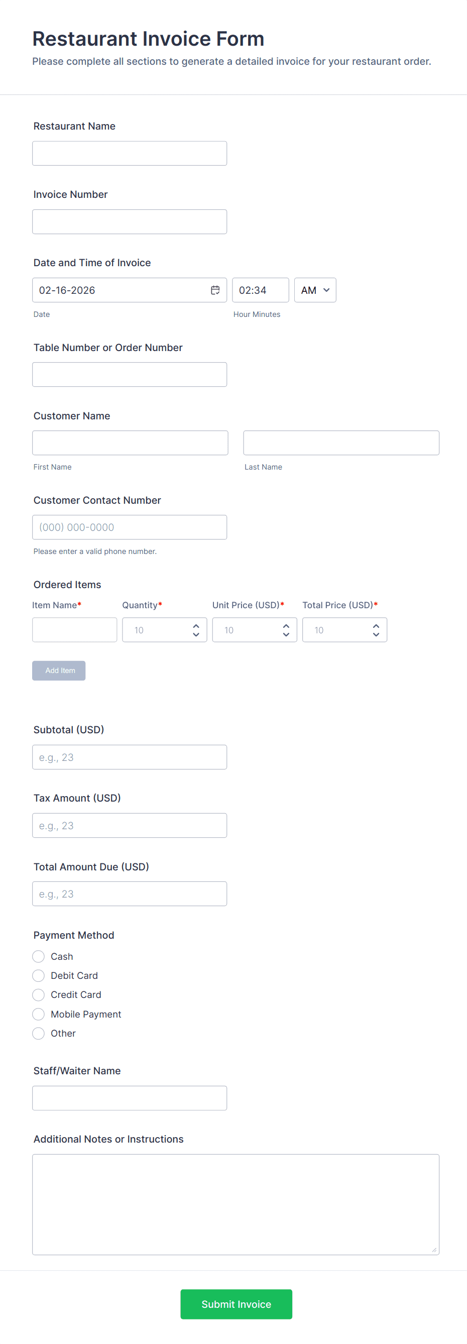 Payment forms are specialized online forms designed to securely collect payments, donations, fees, or orders from customers, clients, or donors. These forms are commonly used by businesses, nonprofits, educational institutions, and service providers to facilitate transactions such as product sales, event registrations, membership fees, or charitable contributions. Payment forms streamline the payment process by allowing users to enter their payment details directly on the form, often integrating with popular payment gateways like PayPal, Stripe, or Square. This eliminates the need for manual invoicing or offline payment collection, making transactions faster and more convenient for both parties.
