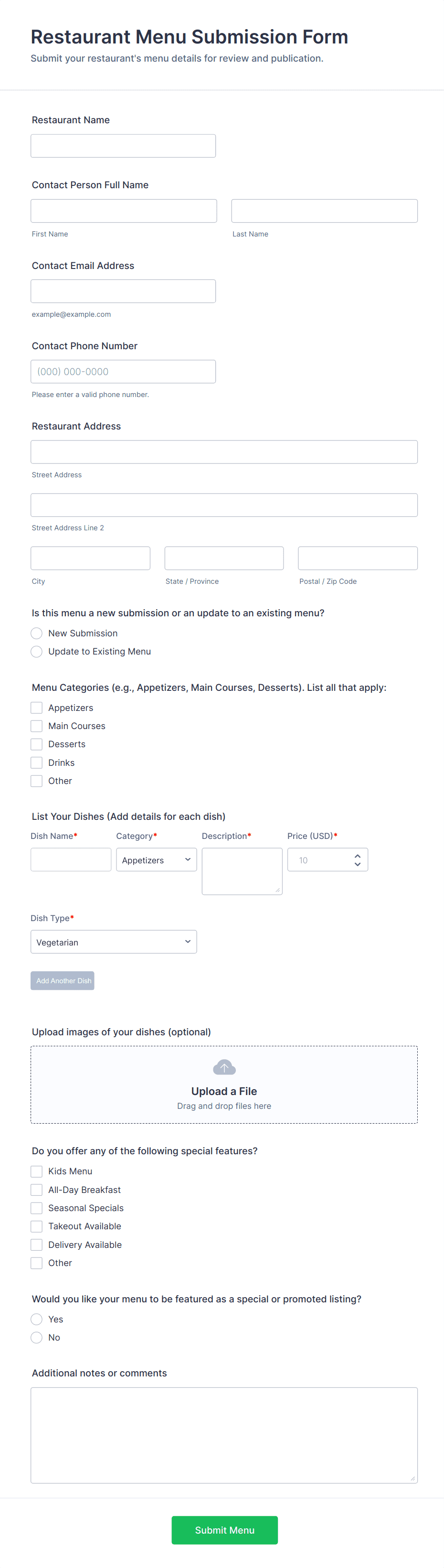 A restaurant form is an online document used by food service businesses to collect information for reservations, orders, feedback, job applications, and more, streamlining communication and operations.