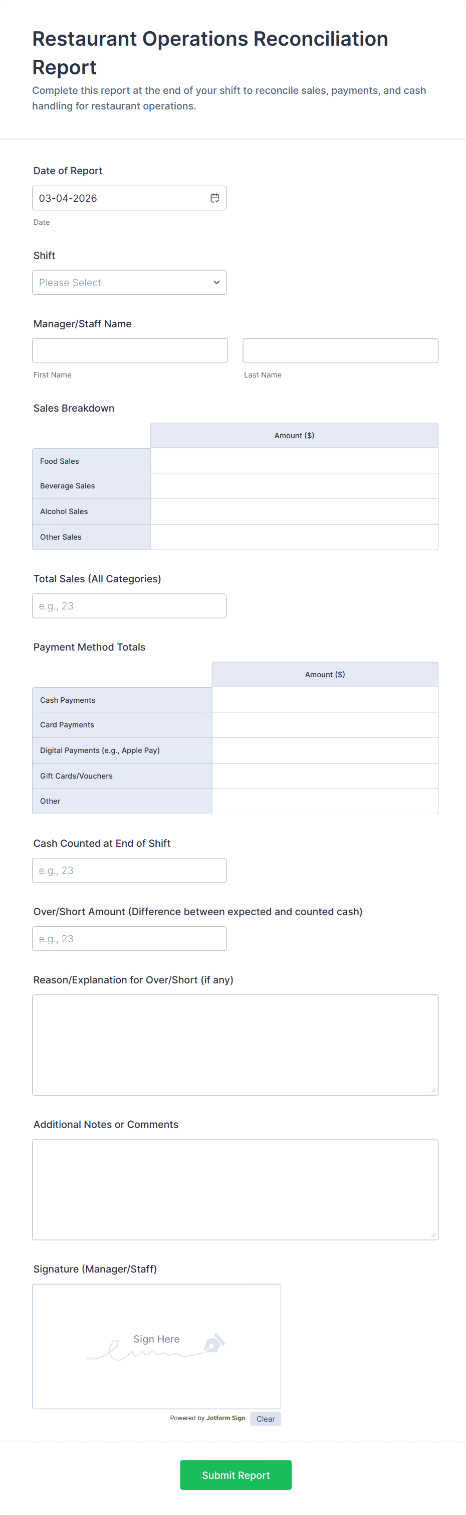 The Cashier Shift Handoff Form from Jotform is a form template that standardizes shift reports, cash counts, and variances using the Jotform Form Builder no-code form builder, drag-and-drop interface, and organized data collection for every form submission.