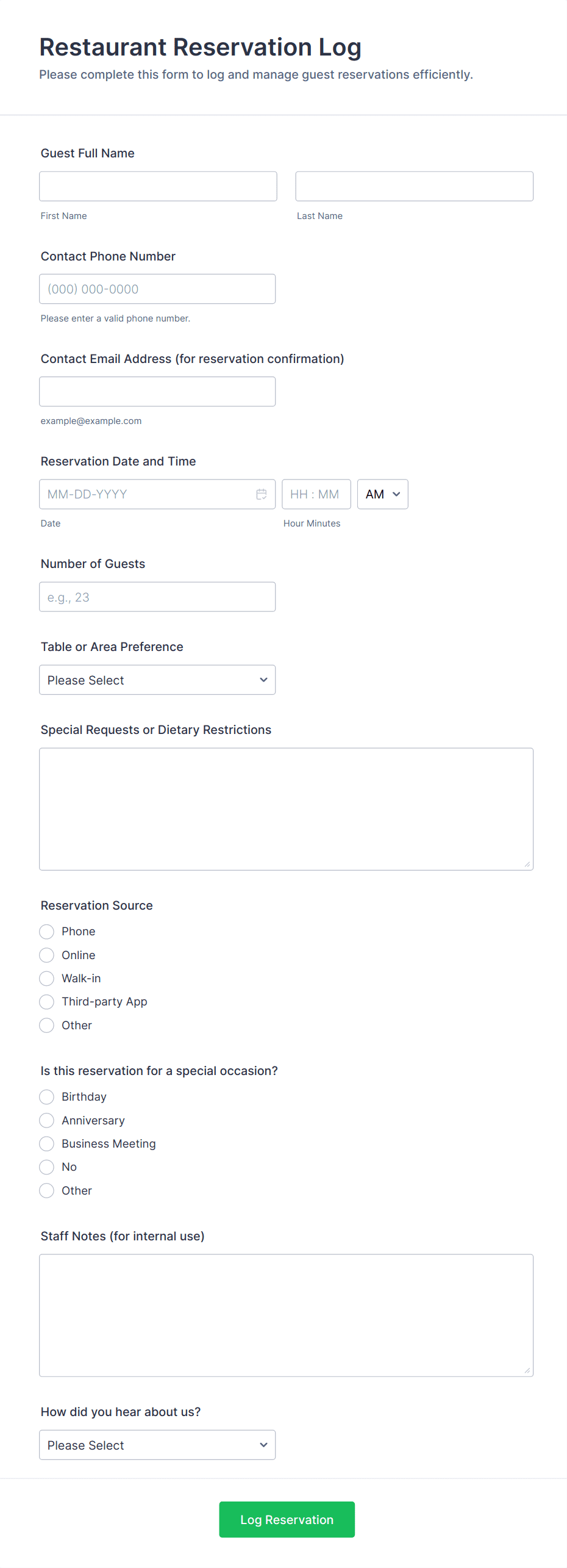 - Restaurants: Forms may include party size, preferred seating, dietary restrictions, and special requests.