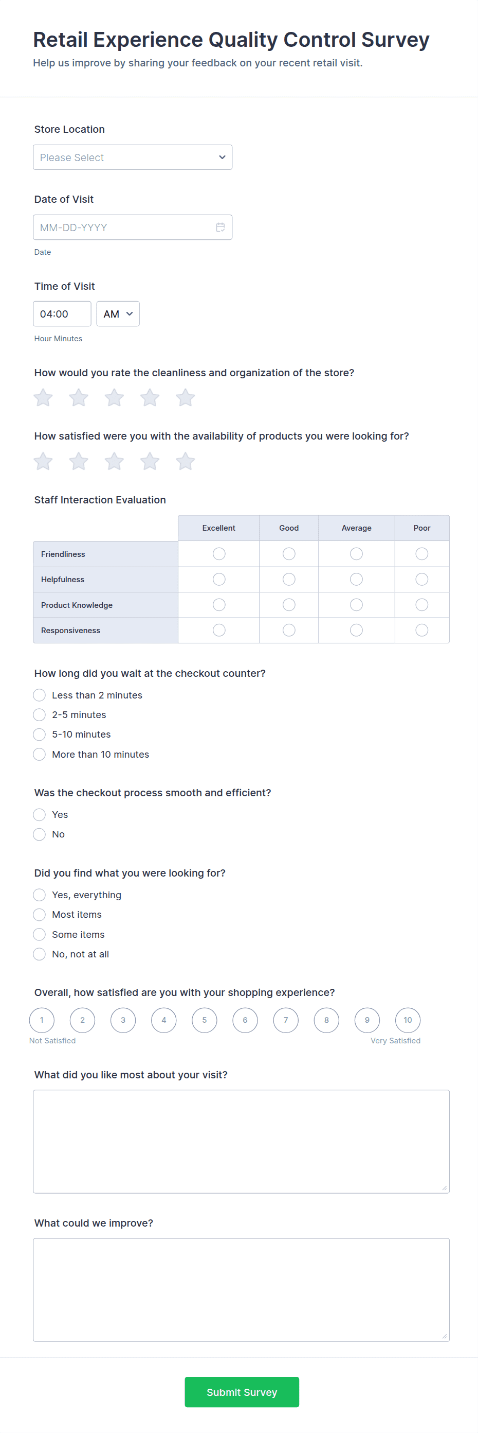 - Short and long text fields for open-ended feedback.
