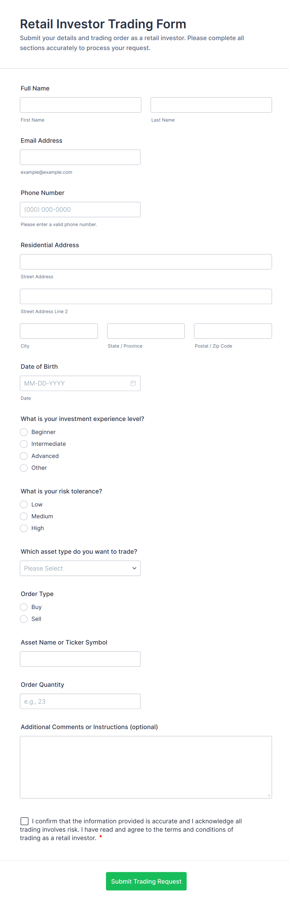 Collect and manage investing information from any device with online Investor Forms from Jotform. Simply choose a template below and customize it with our no-code drag-and-drop builder — you can add your logo, change form fields, include widgets, or connect your form with 100+ free form integrations to sync data to other platforms automatically. Then embed your custom form in your website or share it with a link to start collecting responses instantly! Improve your investment business workflow with Jotform’s online Investor Forms.