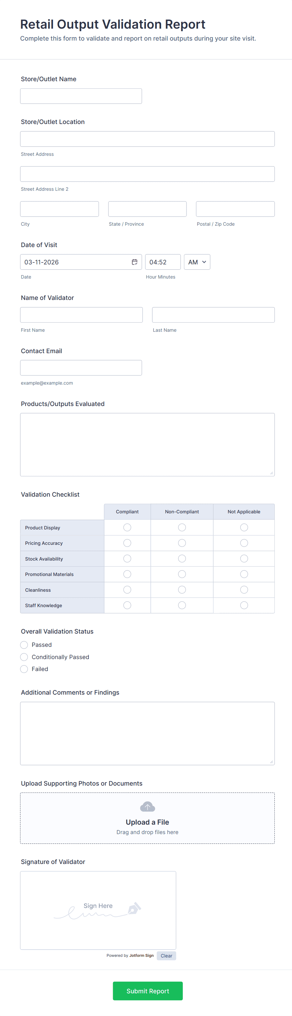 The form templates here are for informational purposes only. Jotform is not providing legal, financial, or other advice, or implying that the forms are legally valid in all or any jurisdictions. Before using any such form, consult an attorney and/or other applicable professionals to make sure that the form meets your needs, legally and otherwise.