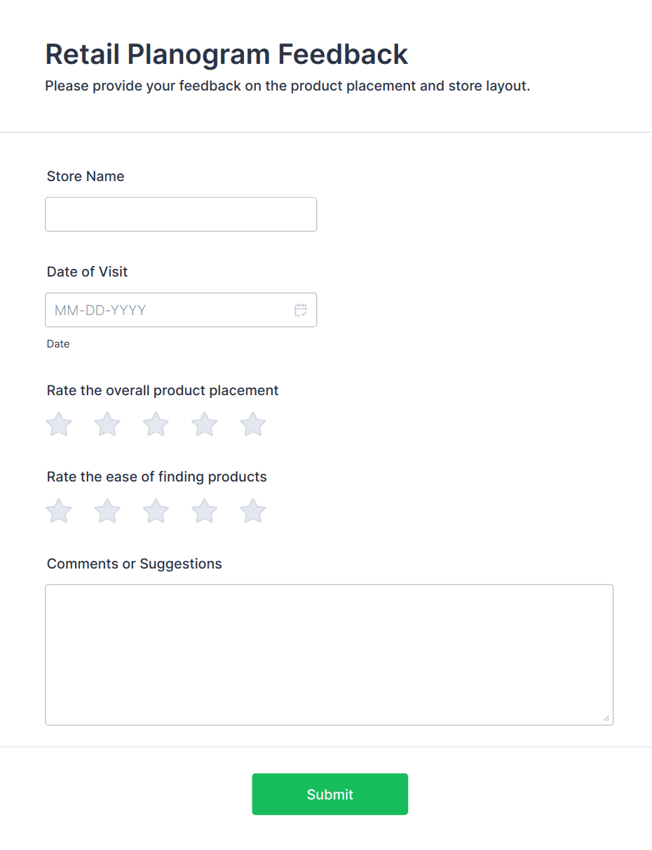 • Product feedback forms may include questions about usability, features, and likelihood to recommend.