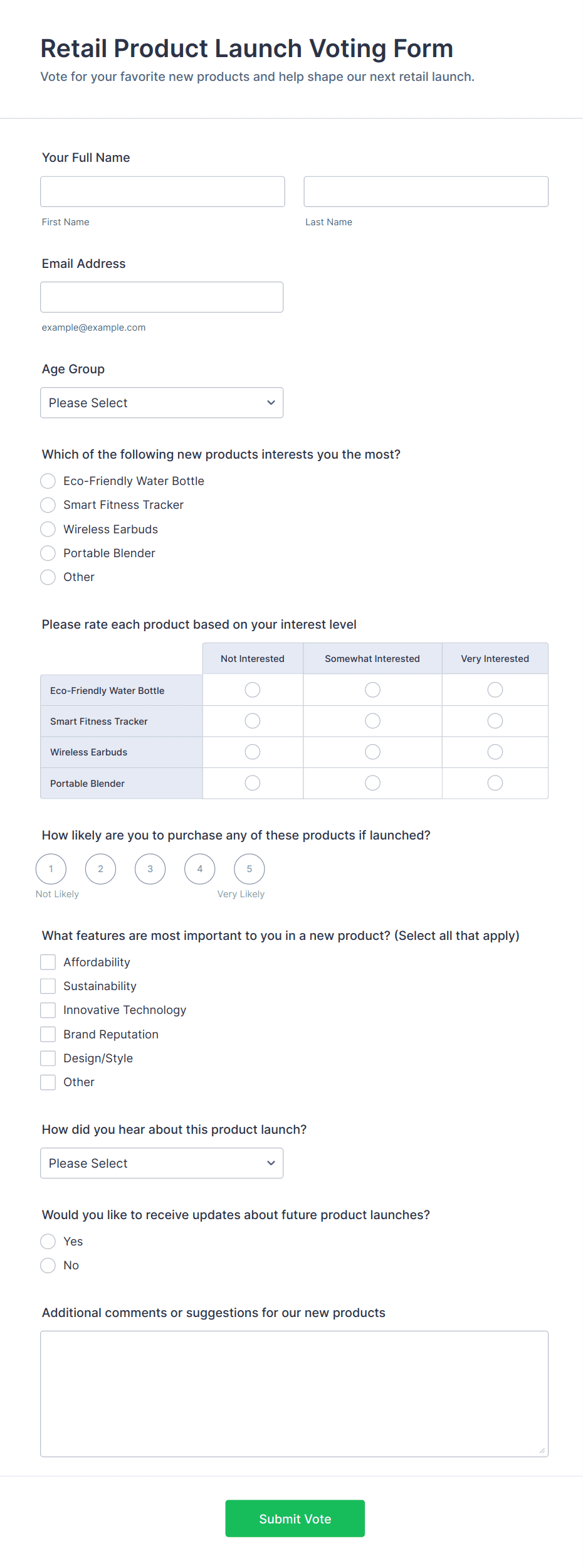 Creating a Product Survey Template with Jotform is a straightforward process that empowers you to gather targeted feedback for any stage of your product’s lifecycle. Whether you’re seeking input on a new concept, evaluating user satisfaction, or prioritizing features, Jotform’s flexible tools make it easy to design, distribute, and analyze your survey.