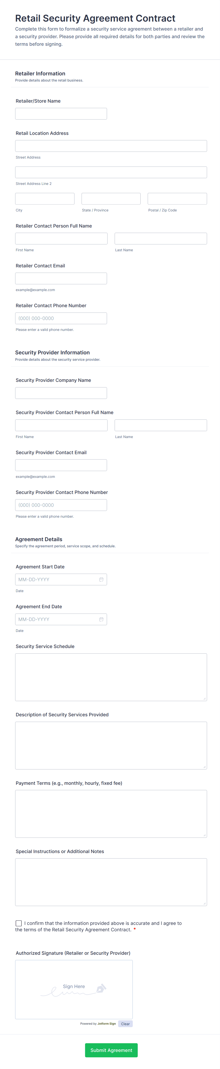 Use this Service Agreement Template and start receiving submissions for the creation of service contracts. Don't waste time building forms in automating your form submissions for receiving service contracts.