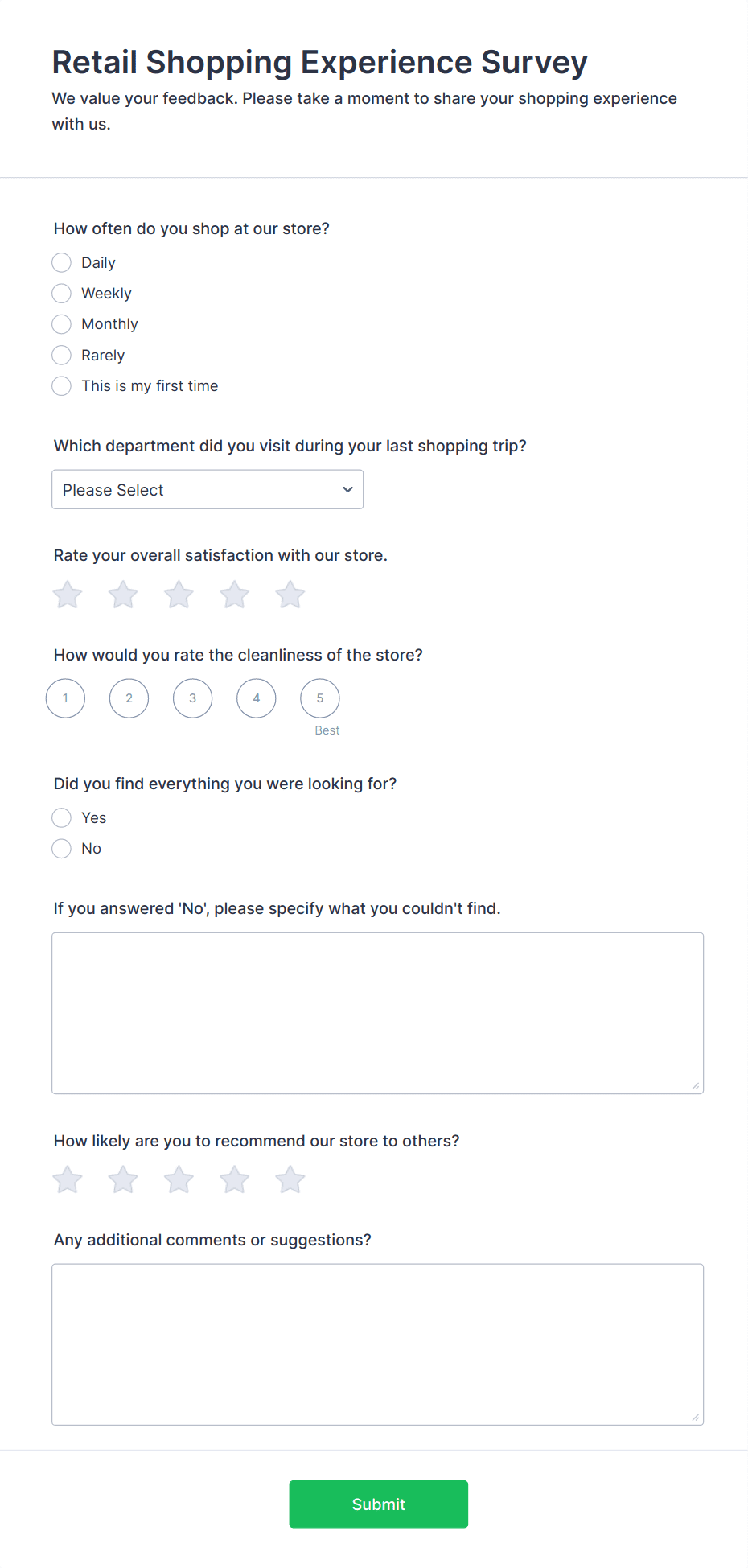 An online shopping survey is a questionnaire used by online stores to collect feedback from their customers. Whether you run a book, magazine, clothing, or furniture store, use this free Online Shopping Survey!