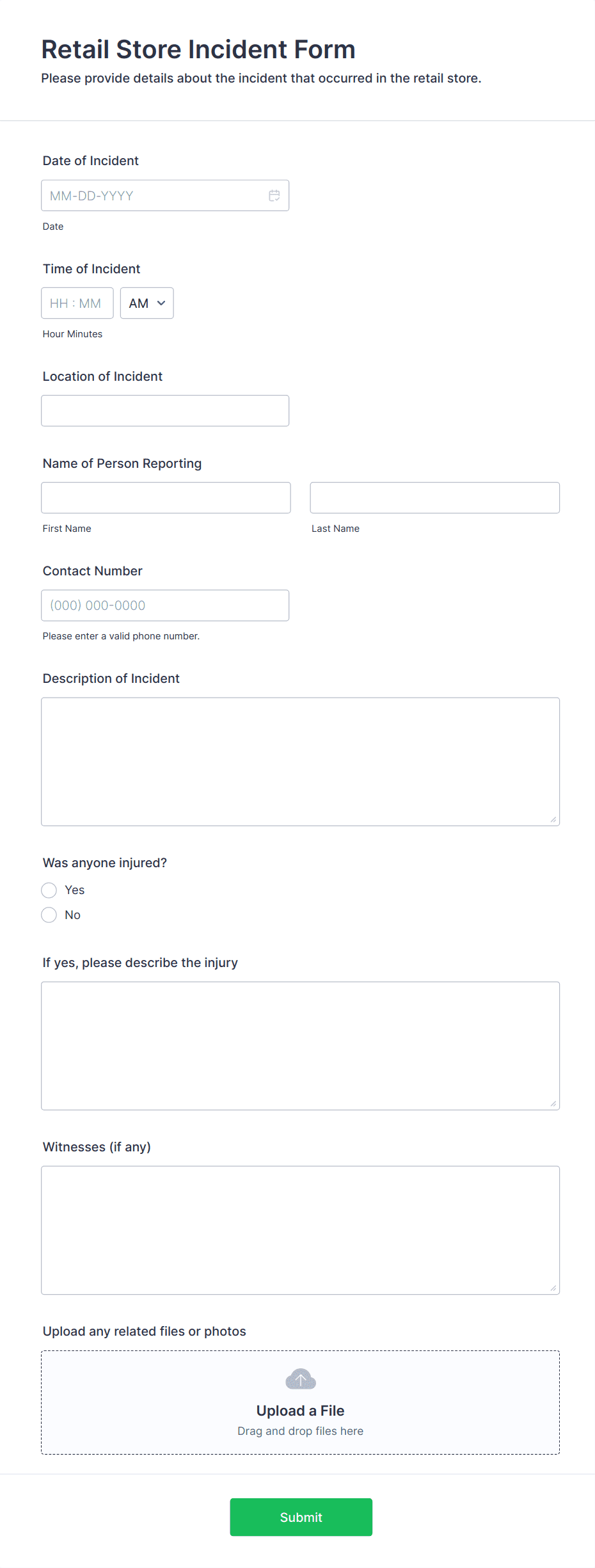 3. What information should be included in an incident report form?