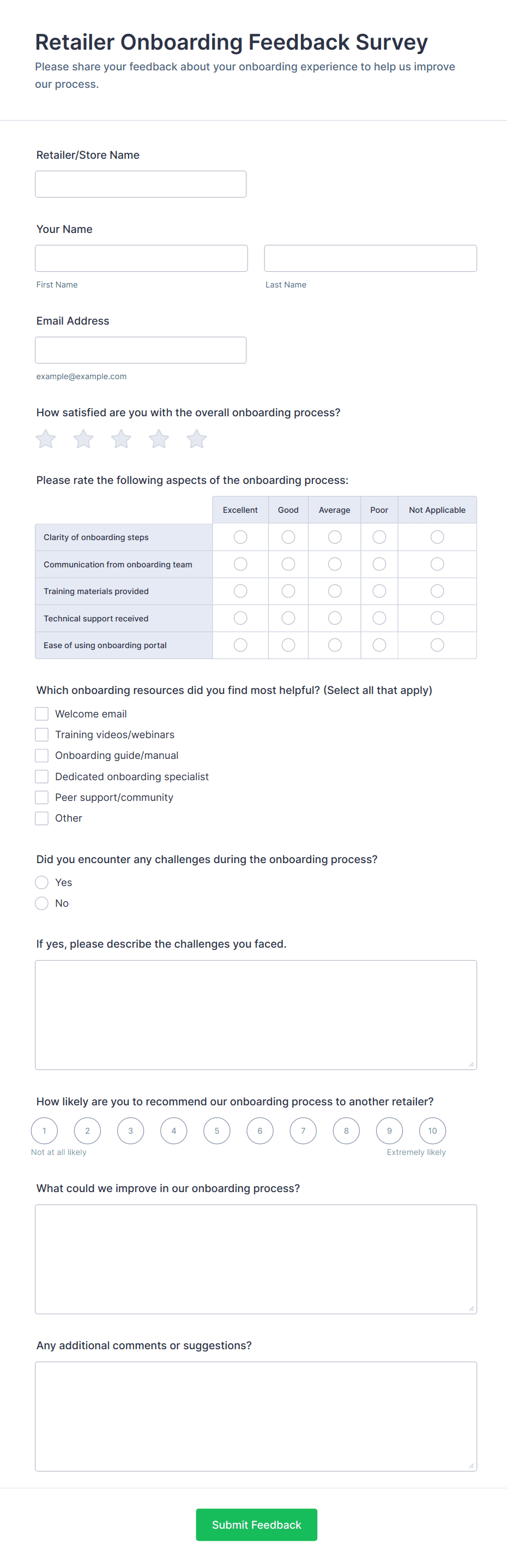 An Onboarding Feedback Questionnaire is a form template designed to gather actionable insights that enable organizations to continuously improve their onboarding processes, enhance employee engagement and retention, and ensure alignment with company culture and values.