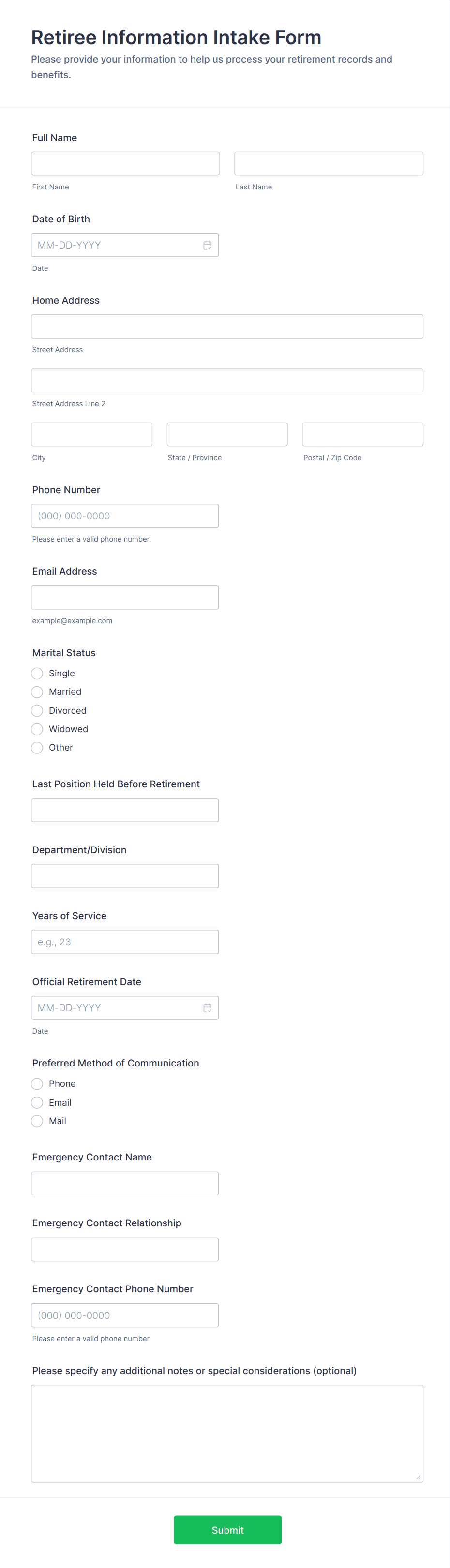 Intake forms are essential tools used to gather preliminary information from clients, patients, customers, or participants before providing a service or beginning a process. These forms streamline the onboarding process by collecting relevant details such as contact information, background data, preferences, and specific needs. Intake forms are widely used across various industries, including healthcare (patient intake), legal (client intake), education (student intake), human resources (employee onboarding), and service-based businesses (client consultations). By standardizing the information-gathering process, intake forms help organizations ensure consistency, improve efficiency, and deliver personalized experiences.