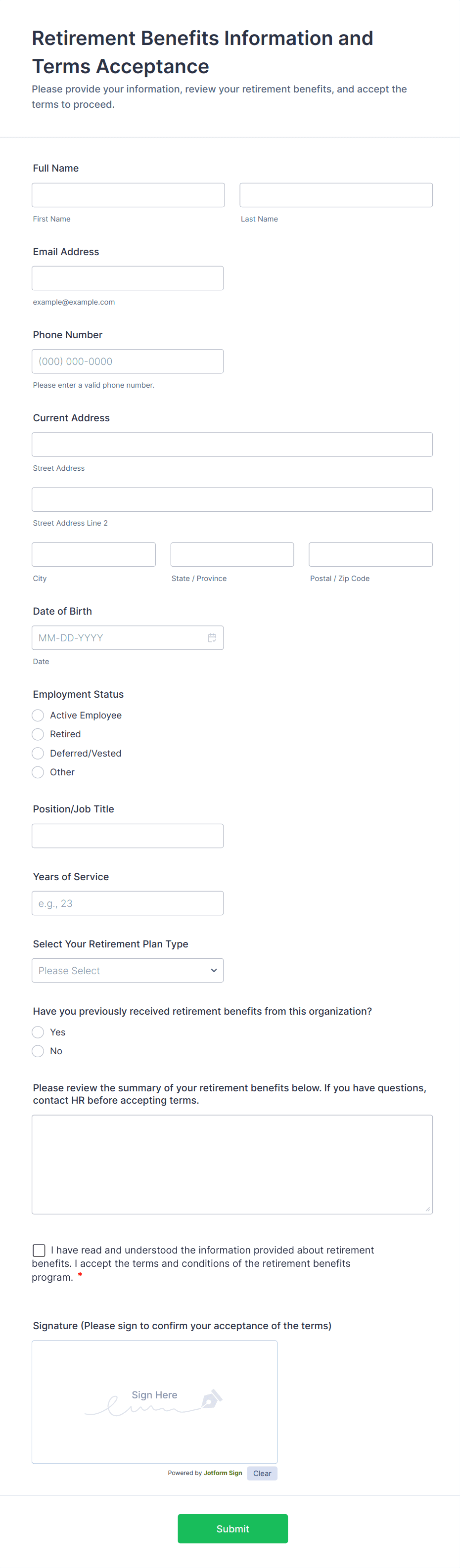 Retirement Benefits Information and Terms Acceptance Form helps employers collect employee acknowledgments for retirement plan information, capture signatures, and centralize responses for benefits administration and recordkeeping.