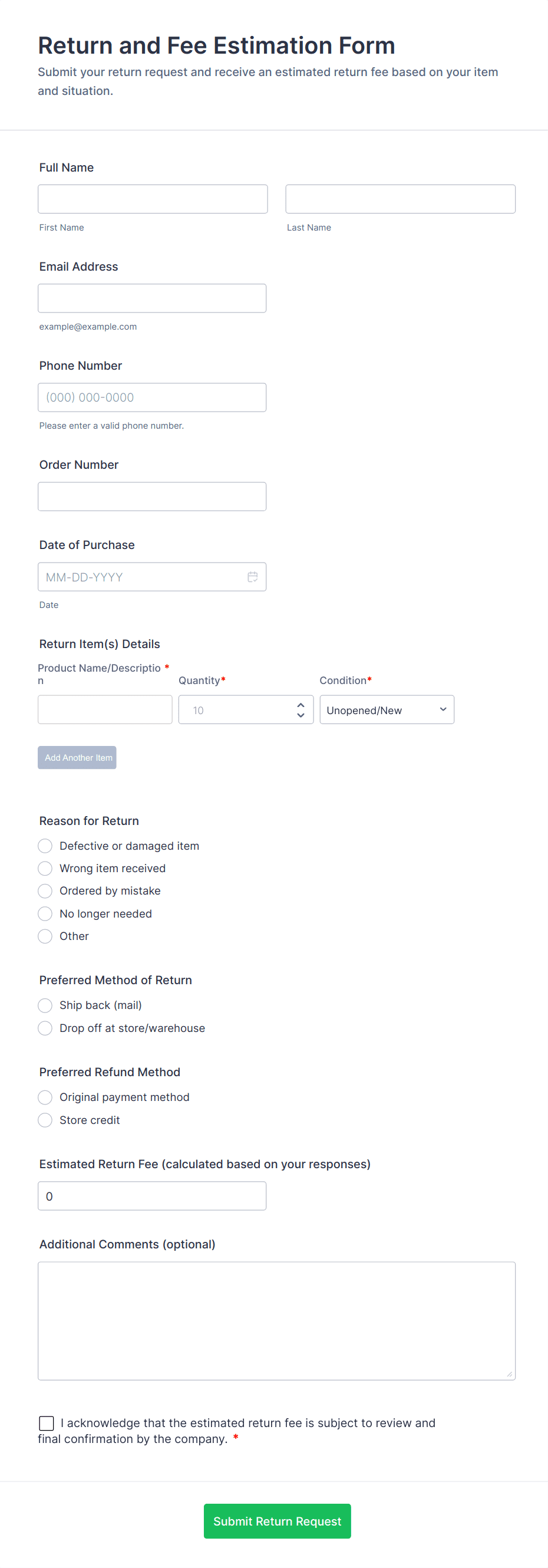 - E-commerce Refunds: May require order number, product details, reason for return, and upload fields for receipts or photos.