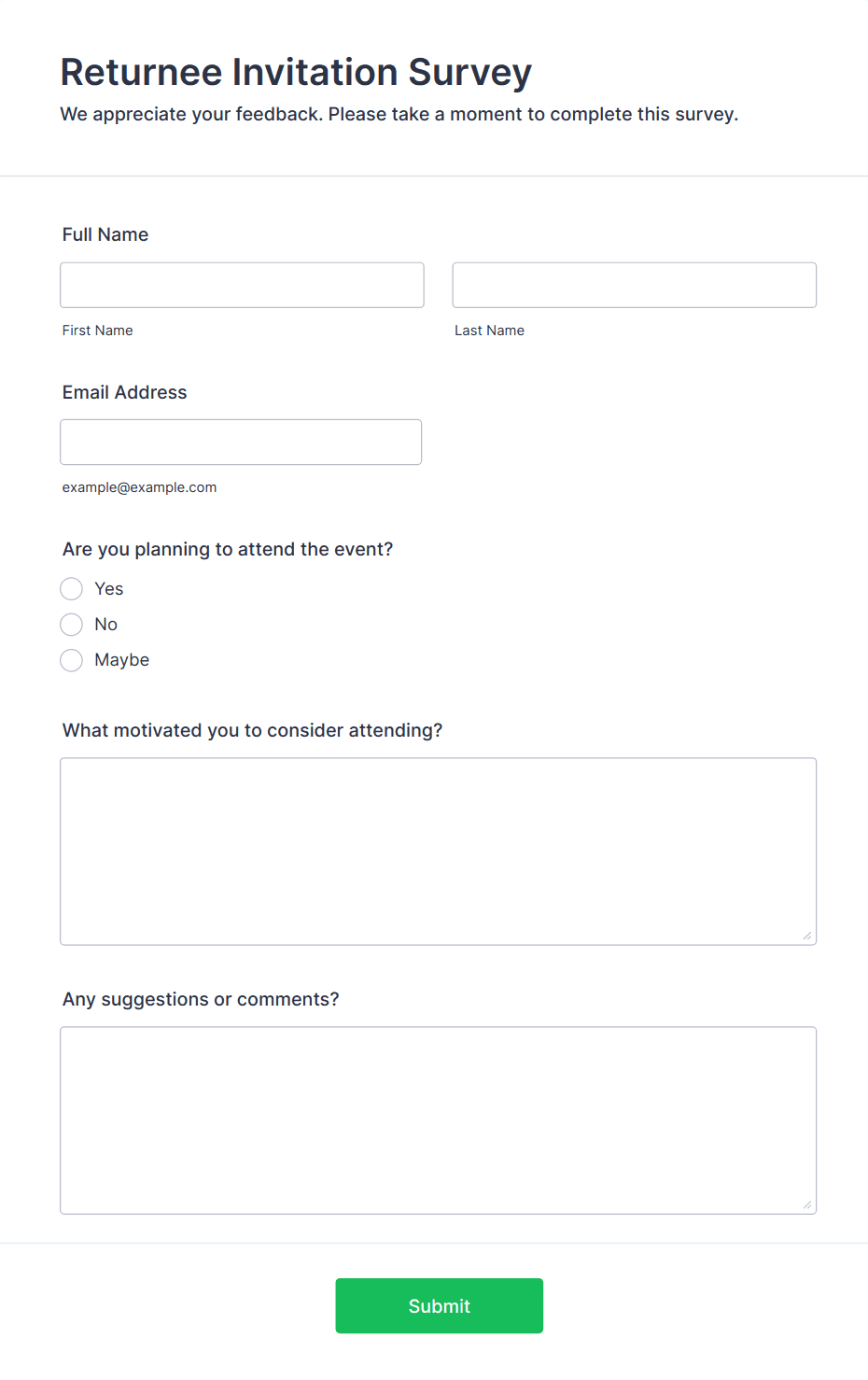 • Event Feedback Surveys: Evaluate attendee satisfaction and gather suggestions for future events.