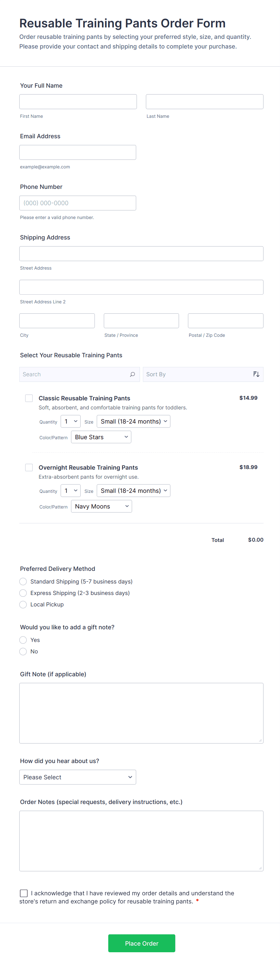 Product order forms are essential tools for businesses and organizations that need to collect orders for physical or digital products online. These forms streamline the process of gathering customer information, product selections, quantities, payment details, and shipping addresses, making it easy to manage sales and inventory. Product order forms can be used in a variety of scenarios, such as e-commerce websites, small businesses selling handmade goods, restaurants offering online ordering, event merchandise sales, or even non-profits collecting orders for fundraising items. Their flexibility allows them to be tailored for single-product checkouts, multi-item catalogs, pre-orders, or subscription-based offerings.