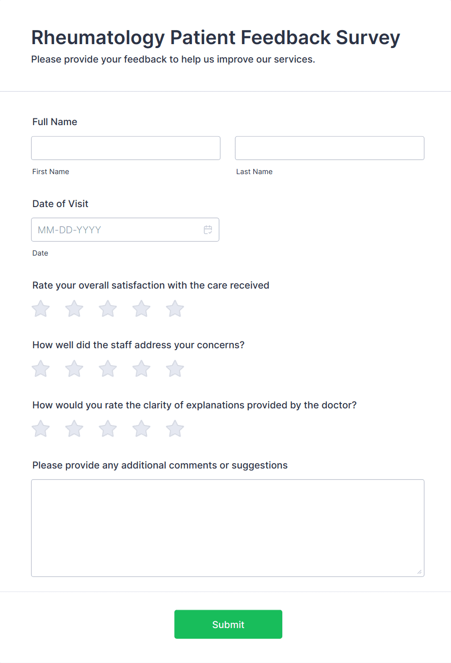 A patient feedback form is a survey with questions that allows medical doctors to gather feedback from patients regarding their overall experience with the clinic.