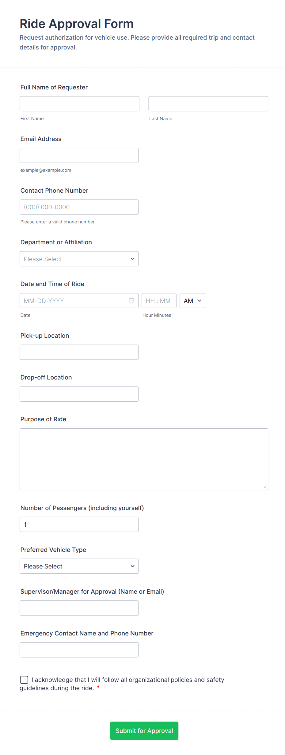 Common fields include passenger or requester details, pickup and drop-off locations, dates and times, vehicle preferences, and any special requirements.