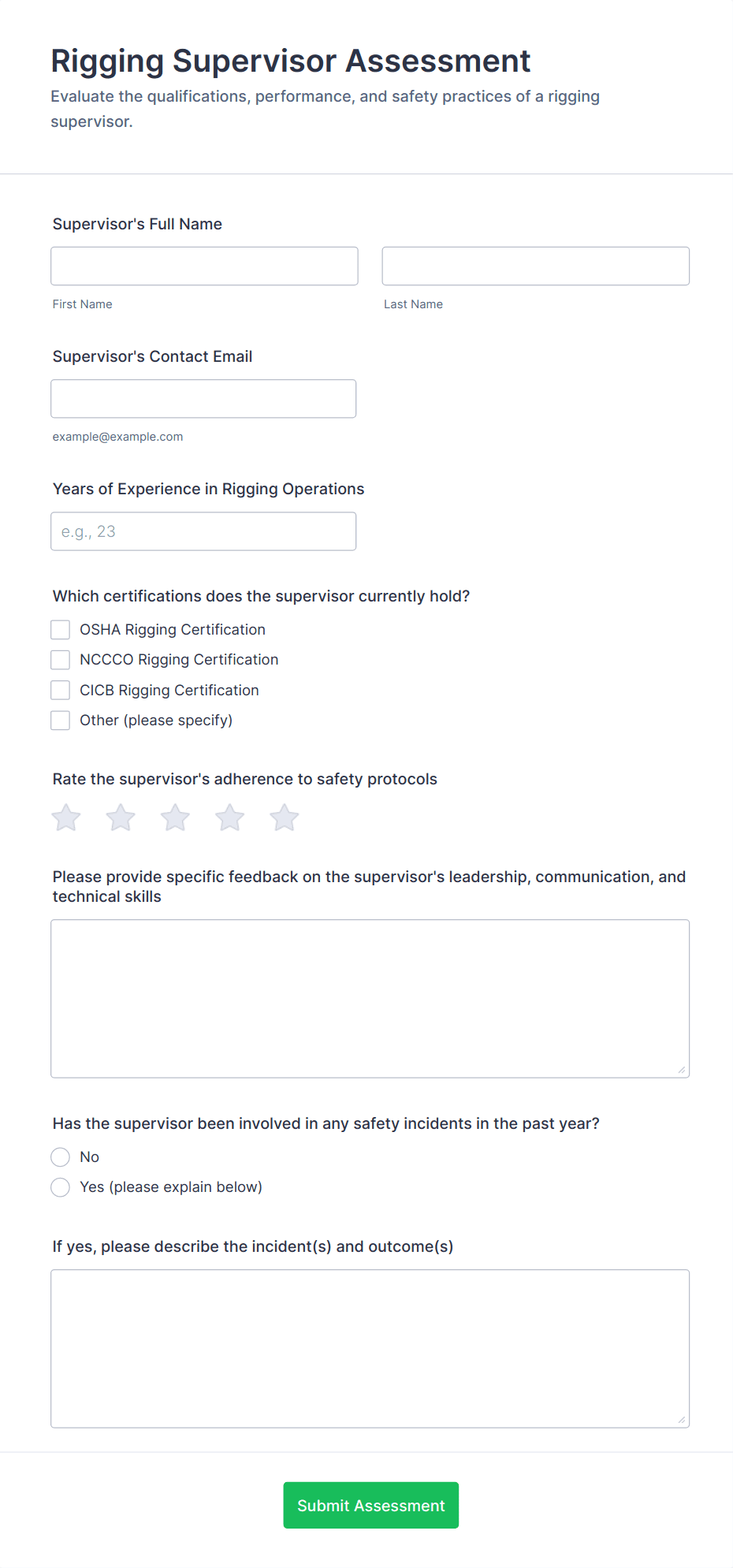 Assessment forms may include personal details, multiple-choice or open-ended questions, rating scales, comment sections, and sometimes automated scoring or feedback fields, depending on the purpose.