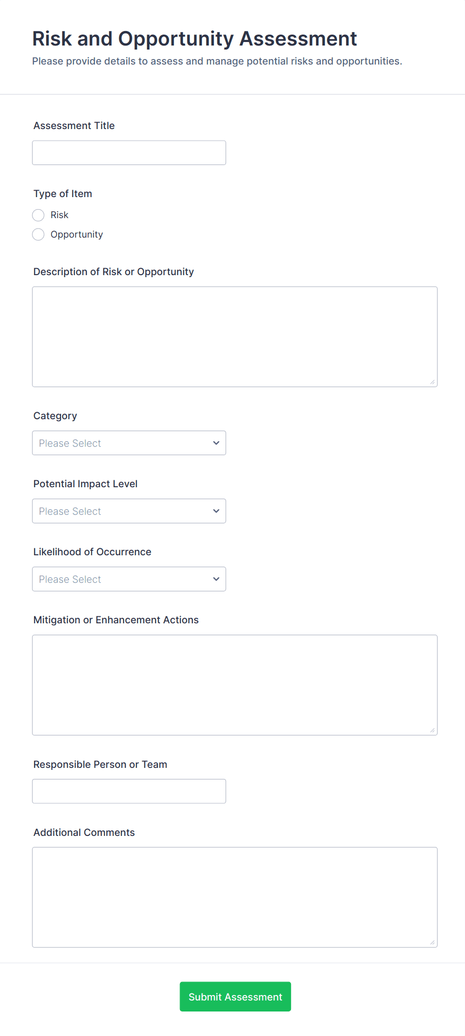 By following these steps, you can create a tailored assessment form that meets your specific needs, streamlines data collection, and provides actionable insights for your organization or project.