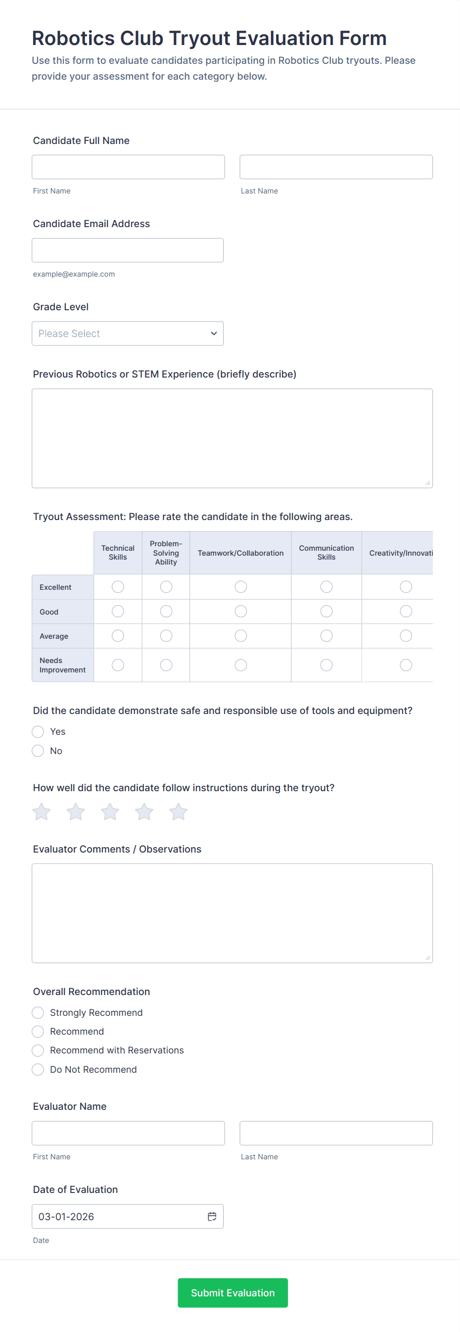 By following these steps, you can create tailored evaluation forms that streamline feedback collection, improve assessment accuracy, and support data-driven improvements in any context.