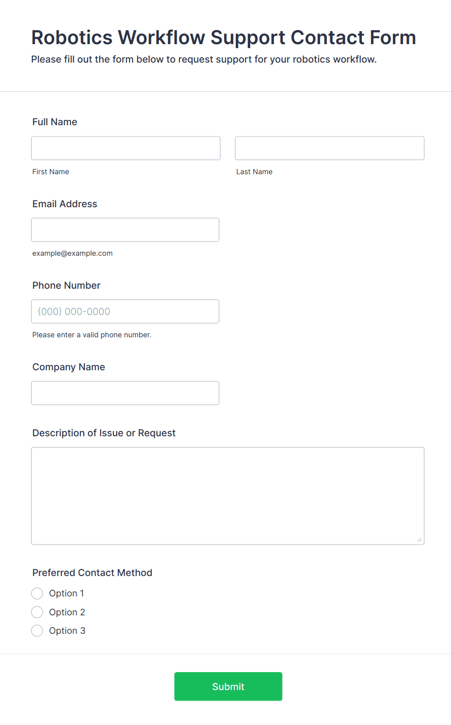 - For specialized use cases, include dropdowns (e.g., inquiry type), checkboxes (e.g., preferred contact method), or file upload fields (for attachments or screenshots).