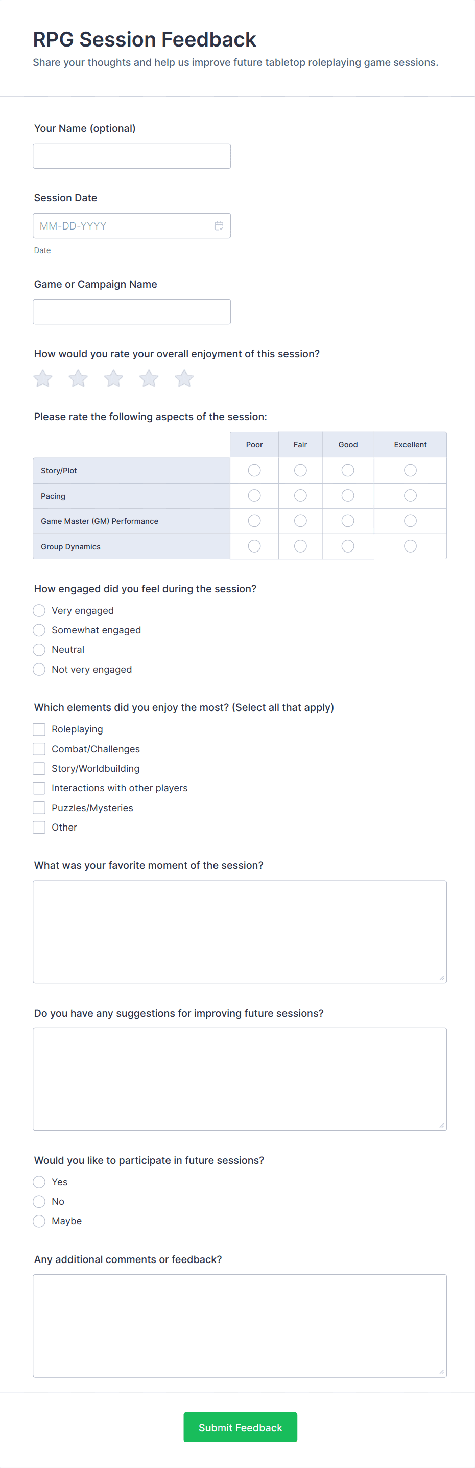 A gaming form template is a pre-designed online form used to collect information related to gaming activities, such as tournament registrations, feedback, event RSVPs, or beta tester applications.