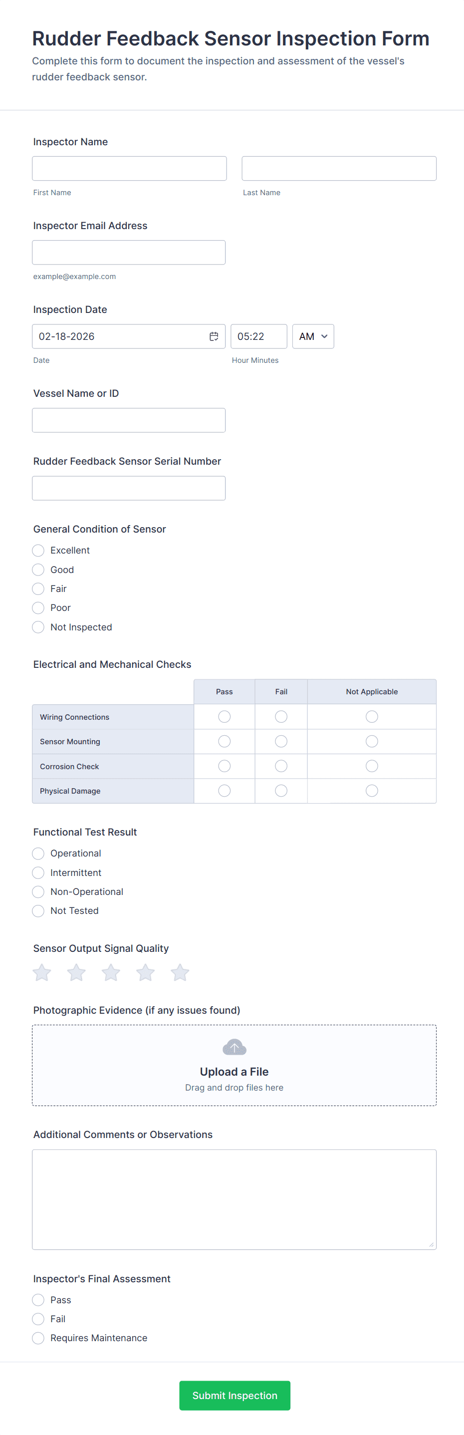 An inspection form is a structured document used to assess, record, and report the condition, compliance, or quality of assets, environments, or processes during an inspection.
