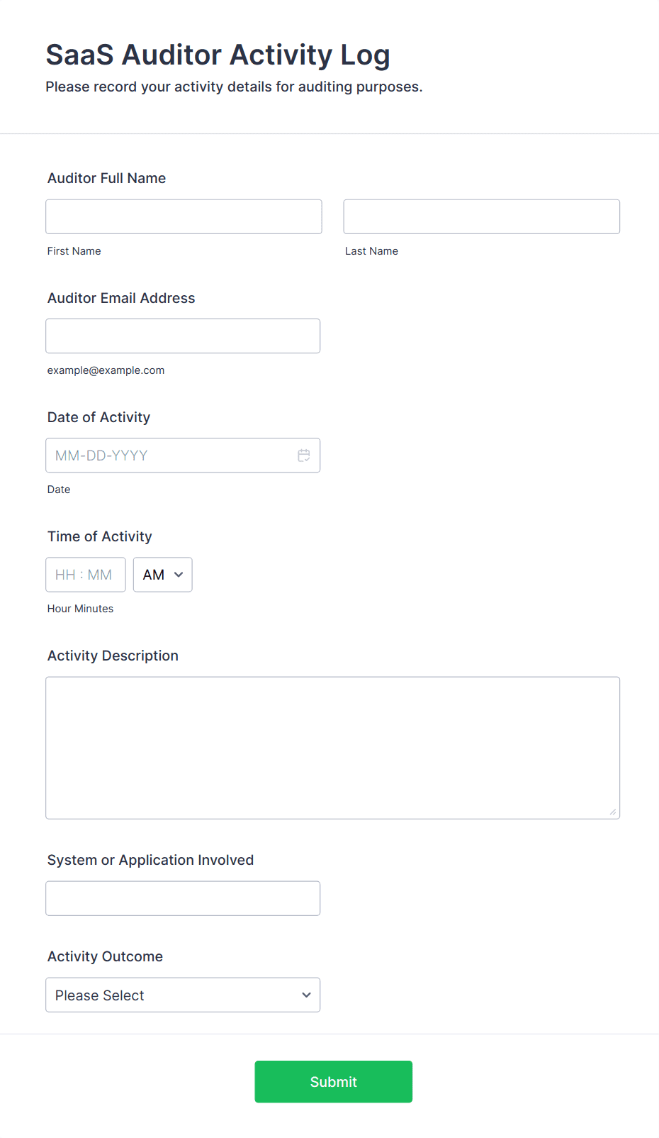 Audit forms are used by safety officers, quality managers, compliance teams, auditors, facility managers, HR professionals, and other stakeholders responsible for oversight and evaluation.