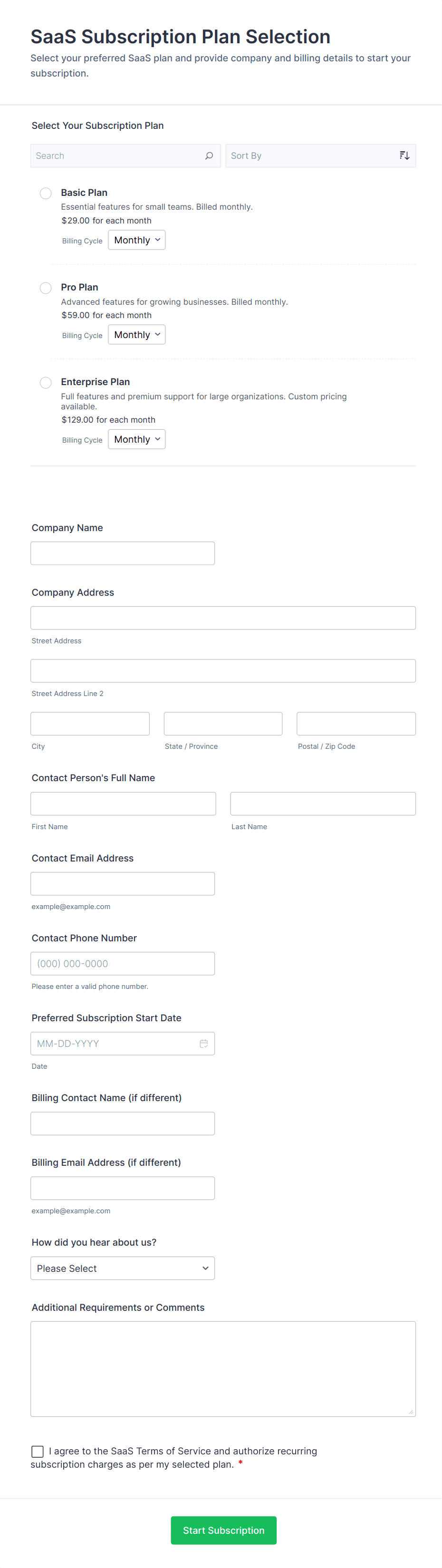 • Product Subscription Forms: Require shipping information, product selection, and recurring payment setup.