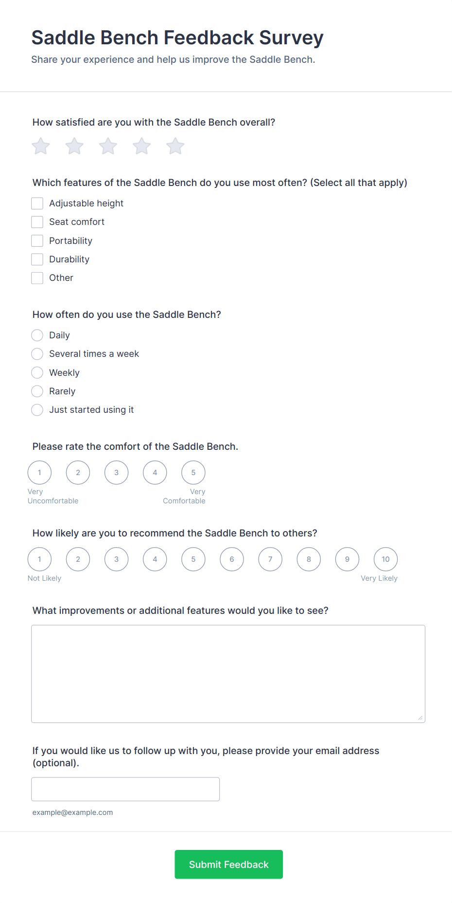 • For customer feedback, include questions about satisfaction, product quality, and likelihood to recommend.