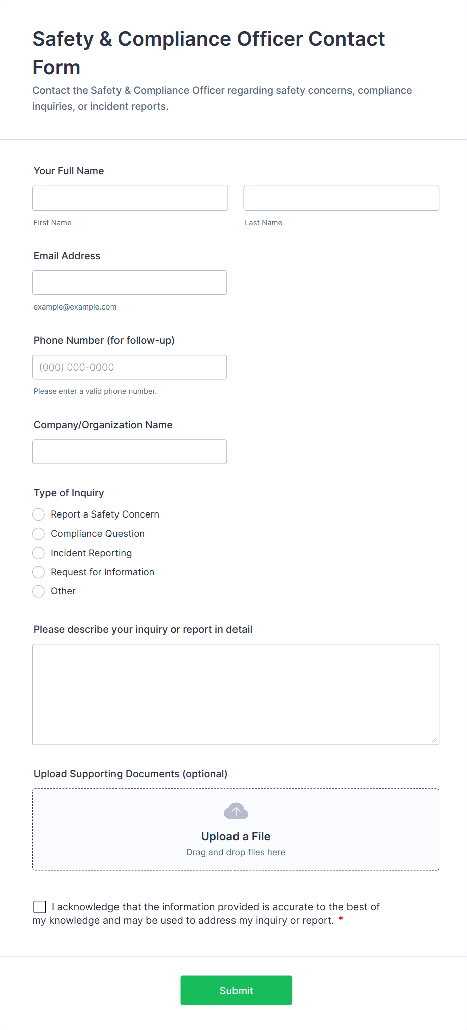 Customize your Incident Report Forms to suit your needs with Jotform’s intuitive no-code builder. Simply drag and drop to include your logo, add or update form fields, include checklist items, change fonts and colors, and more. Connect with our 100+ integrations such as Dropbox, OneDrive, or Airtable to automatically sync your submissions. Form responses are stored in your secure Jotform account and protected with a 256-bit SSL connection, CCPA compliance, PCI compliance, and optional HIPAA compliance.