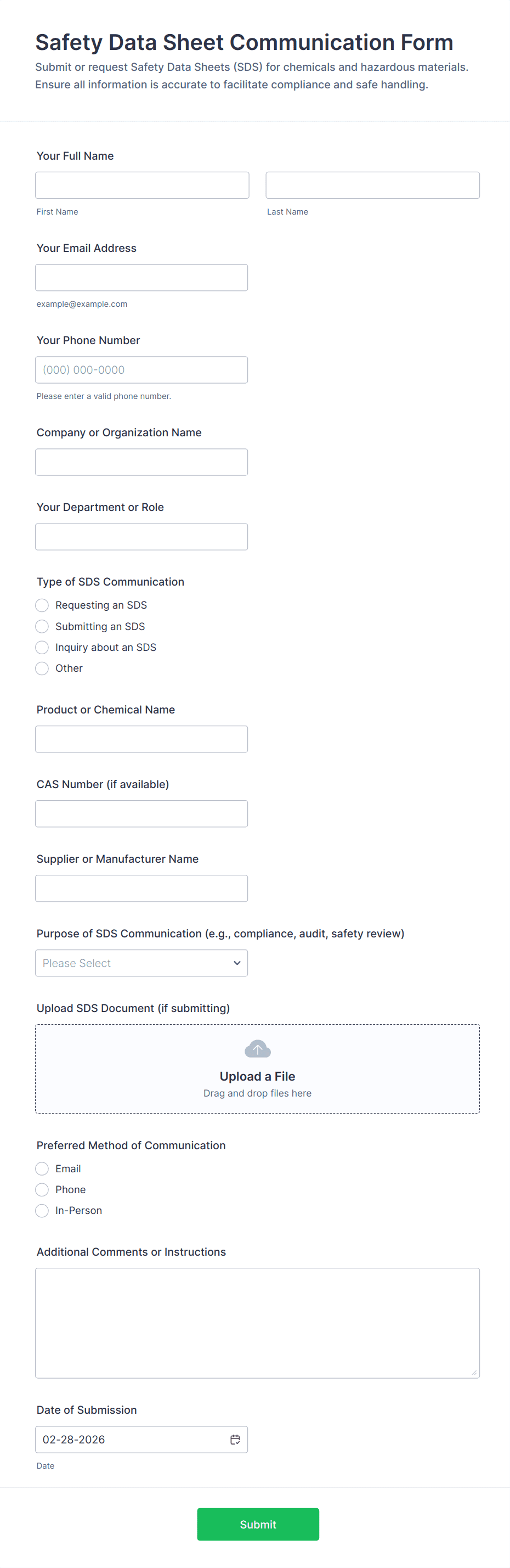 Hazardous material forms are structured documents used to manage, document, and control activities involving hazardous substances, including handling, storage, transport, disposal, and incident reporting. They help organizations collect consistent information about materials, risks, safety requirements, and compliance steps so hazardous materials are managed safely and in line with regulations and internal policies. Hazardous material forms are commonly used in laboratories, manufacturing sites, warehouses, construction environments, healthcare facilities, and environmental services for workflows like hazardous material inventory, safety checklists, spill reporting, waste disposal requests, and transport declarations. By standardizing hazardous material documentation, these forms reduce safety risks, improve accountability, and support audit readiness.