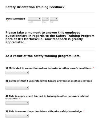 A Training Feedback Form is a form template designed to collect feedback from trainees about a training session.
