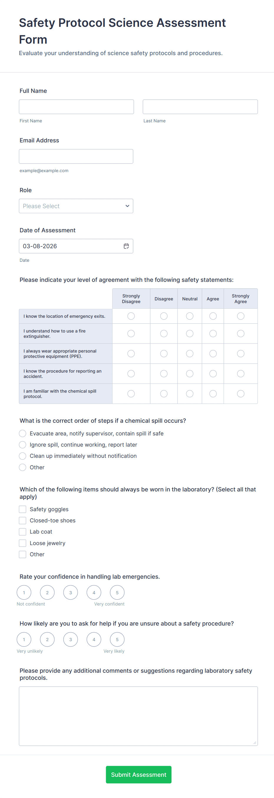 Histology Techniques Assessment Form helps educators and lab managers evaluate histology experience, proficiency, and training needs using an online, customizable Jotform assessment template.