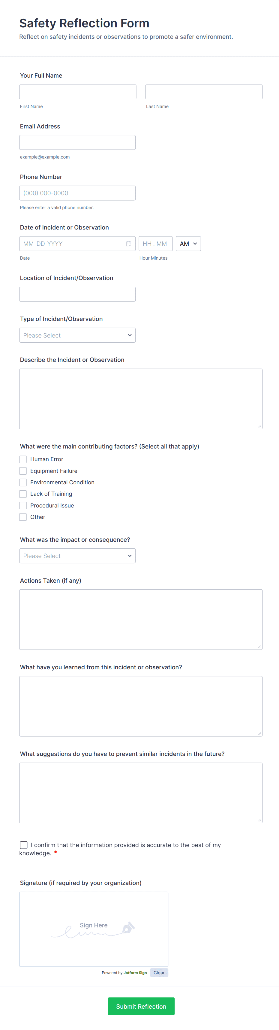 Customize your Incident Report Forms to suit your needs with Jotform’s intuitive no-code builder. Simply drag and drop to include your logo, add or update form fields, include checklist items, change fonts and colors, and more. Connect with our 100+ integrations such as Dropbox, OneDrive, or Airtable to automatically sync your submissions. Form responses are stored in your secure Jotform account and protected with a 256-bit SSL connection, CCPA compliance, PCI compliance, and optional HIPAA compliance.