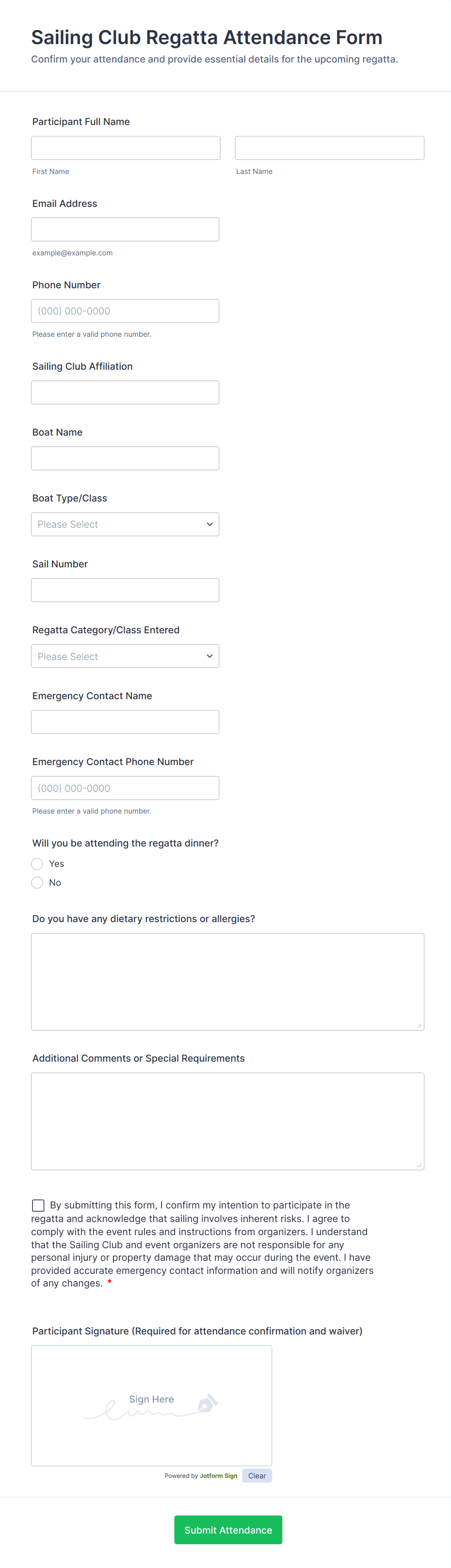 RSVP forms are digital tools designed to collect responses from invitees regarding their attendance at events, gatherings, meetings, or special occasions. Whether you’re organizing a wedding, corporate seminar, birthday party, or community event, RSVP forms streamline the process of confirming guest participation, gathering essential details like meal preferences, plus-ones, or special requirements. These forms help event organizers efficiently manage headcounts, plan logistics, and ensure a smooth experience for both hosts and attendees. The versatility of RSVP forms means they can be tailored for formal galas, casual get-togethers, virtual webinars, or even recurring club meetings.