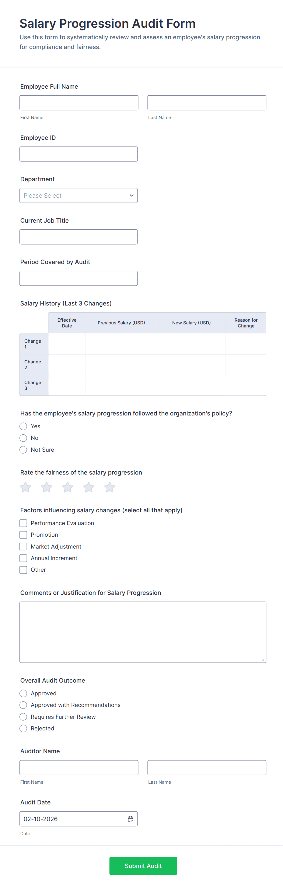 Audit forms are used by safety officers, quality managers, compliance teams, auditors, facility managers, HR professionals, and other stakeholders responsible for oversight and evaluation.