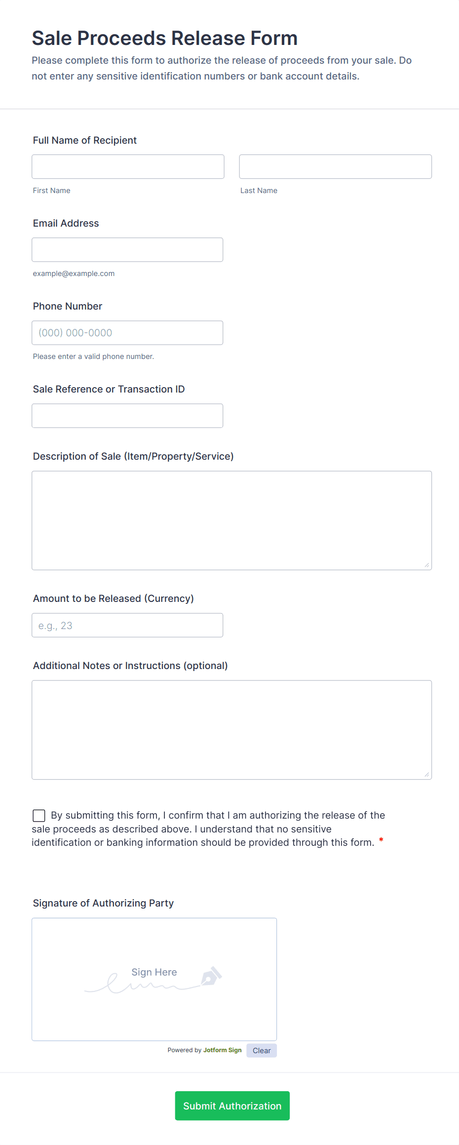 - Digital signature field for legal acknowledgment.