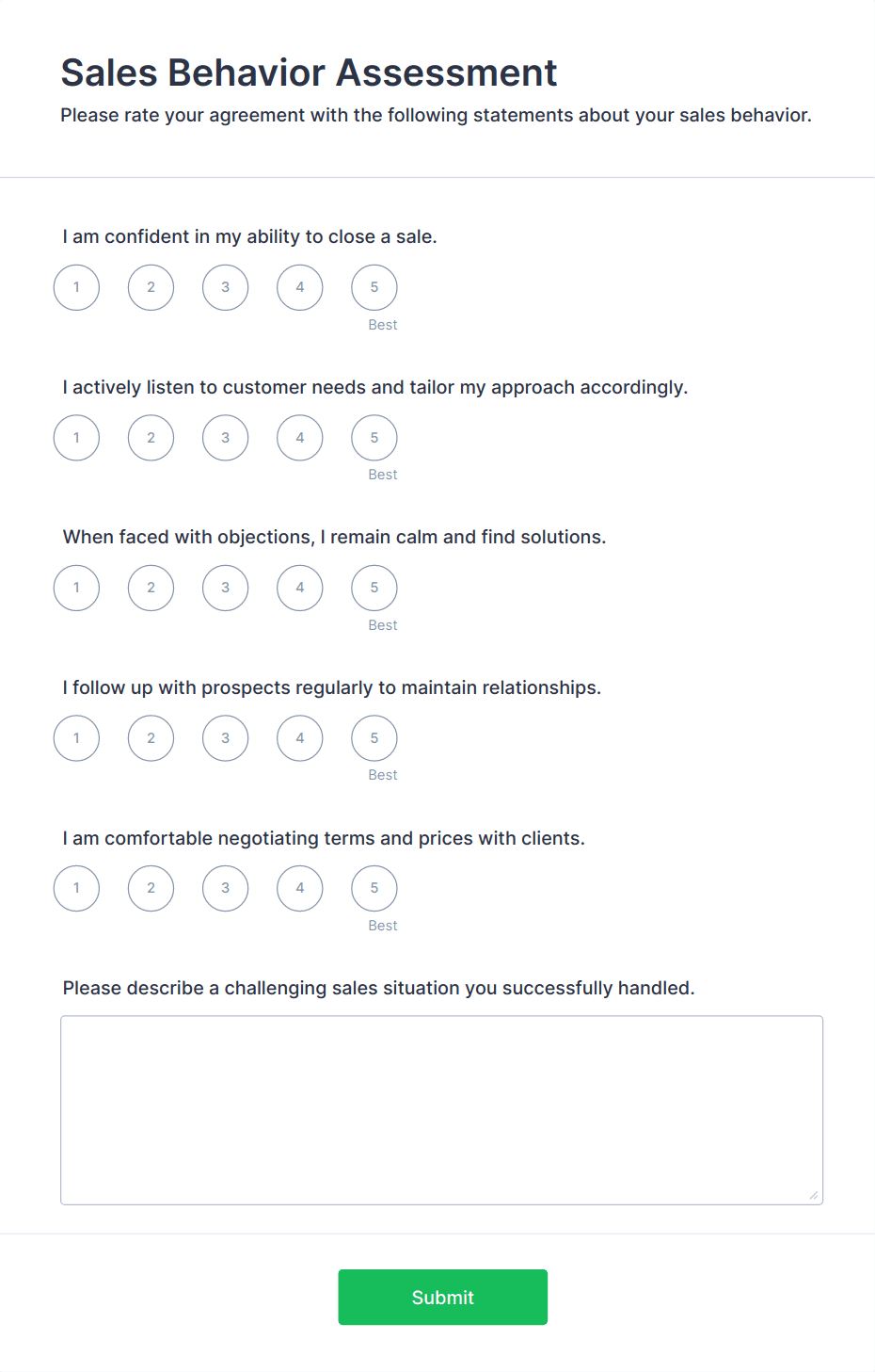 Assessment forms may include personal details, multiple-choice or open-ended questions, rating scales, comment sections, and sometimes automated scoring or feedback fields, depending on the purpose.